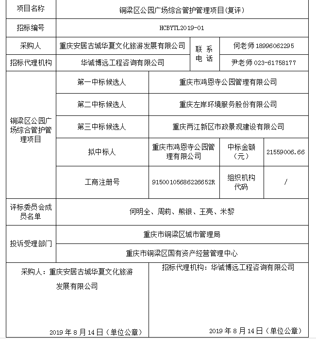 备注:1、投标人或者其他利害关系人对中标结果公示有异议的,应当先向招标人提出异议,由招标人及其招标代理机构答复;对答复不满意的,才能向有关行政部门投诉。投诉应当按照《工程建设项目招标投标活动投诉处理办法》(国家发展改革委等七部委令第11号)执行和《重庆市招标投标活动投诉处理实施细则》(渝发改标【2014】1168号)执行。