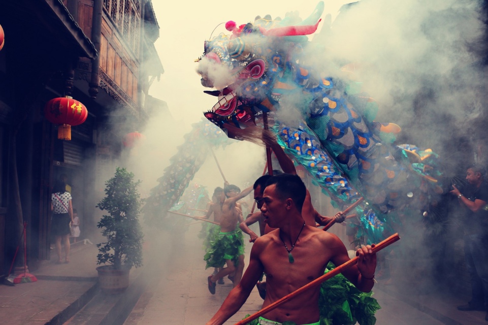 安居人,好似都趟着滚烫的龙魂。每逢佳节,总要扎上几条龙来耍龙舞,火龙、水龙、稻草龙、板凳龙、扁担龙、大蠕龙等等....据说这样有着祈福、灾祛邪之意。无论是大人或小孩,都爱看龙舞,看它千姿百态,看它气势磅礴。