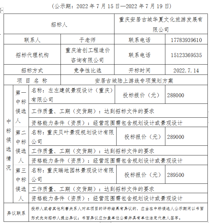 下一篇: 重庆安居古城华夏文化旅游发展有限公司 中标候选人公示表