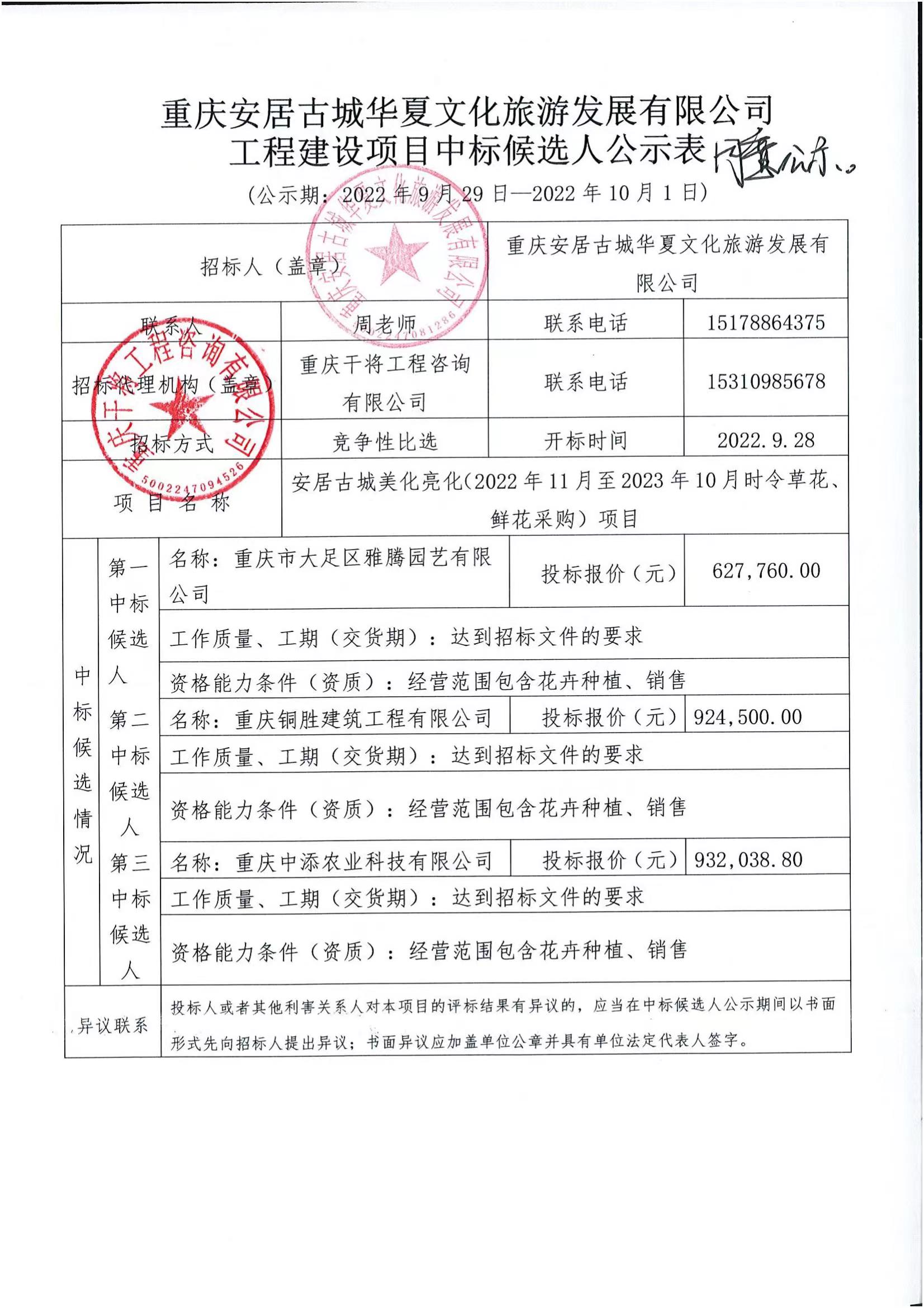 重庆安居古城华夏文化旅游发展有限公司,2013年01月23日成立,经营范围包括安居古城景区旅游项目开发建设和经营管理;房地产开发经营;土地开发整治;公共市政设施和基础设施建设开发;园林规划、设计、施工;园林绿化工程设计、施工;园林绿化养护(按资质证核定事项从事经营);水利建设;淡水鱼、观赏鱼养殖;树木(不含苗木)种植、销售;蔬菜、瓜果种植销售;农业观光旅游;旅游广告经营及代理(不含印刷品广告);承办经批准的文化艺术交流活动;旅游文化工艺品开发销售;国内旅游招徕、组织、接待;导游服务;旅游景区收费;旅游景区电瓶车、游船、碰碰船、游艇、水上飞机游乐项目经营;旅游宣传营销;旅游文化活动策划。