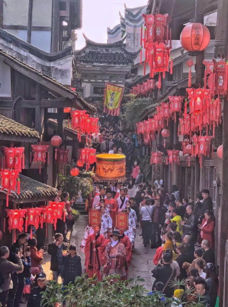 新春到来,欢喜盈门。农历大年初二,安居古城喜迎八方游客。来自五湖四海的朋友早早便踏着新年的气息,携亲眷、伴朋友,满怀喜悦相聚于此,欢欢喜喜过新年,祈盼一年的好运气。作为首届重庆铜梁中华龙灯艺术节分会场的安居古城景区,两万多个高高挂起的红灯笼,20多组造型各异的龙灯灯组把古城衬托得更加美丽,让游客感受到浓浓的年味。今年春节,安居古城在展演传统的县令出巡、武士巡街、抬花轿、划旱船、川剧座唱、民俗大巡